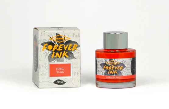 Чернила Coral Blaze из новой пигментной серии от Diamine Forever ink. Цвет чернил создает не водорастворимый краситель, а взвесь наночастиц пигментов.