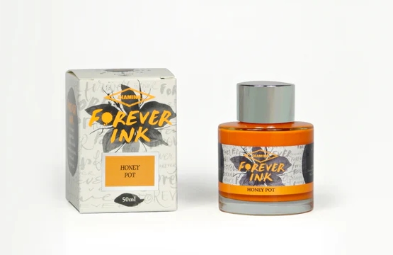Чернила Honey Pot из новой пигментной серии от Diamine Forever ink. Цвет чернил создает не водорастворимый краситель, а взвесь наночастиц пигментов.