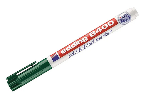 Перманентный маркер для нанесения надписей на дисках Edding 8400. Мягкий наконечник и пигментные чернила позволяют наносить перманентную маркировку, не повреждая поверхности. Заостренный наконечник оставляет тонкие линии шириной около 1.0 мм.